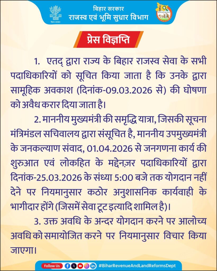 पटना: बिहार सरकार के राजस्व एवं भूमि सुधार विभाग ने हड़ताल पर गए बिहार राजस्व सेवा के अधिकारियों के खिलाफ सख्त रुख अपना लिया है। विभाग द्वारा जारी एक हालिया प्रेस विज्ञप्ति में स्पष्ट किया गया है कि अधिकारियों द्वारा 9 मार्च 2026 से घोषित ‘सामूहिक अवकाश’ को अवैध करार दे दिया गया है।