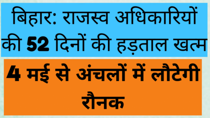 पटना। बिहार में पिछले दो महीनों से जमीन संबंधी कार्यों के लिए परेशान आम जनता के लिए राहत भरी खबर है। राज्य में 9 मार्च से जारी बिहार राजस्व सेवा संघ के अधिकारियों का सामूहिक अवकाश गुरुवार को समाप्त हो गया। सरकार द्वारा मांगों पर सहानुभूतिपूर्वक विचार करने के आश्वासन के बाद यह गतिरोध दूर हुआ है। आगामी 4 मई से सभी राजस्व अधिकारी अपने कार्यों पर लौट आएंगे, जिससे ठप पड़े जमीन से जुड़े कार्यों में एक बार फिर रफ्तार आएगी।