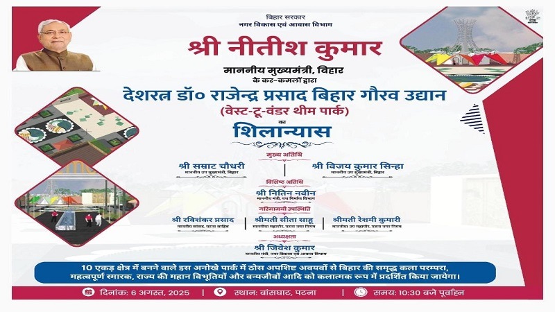पटना: बिहार के नगर विकास एवं आवास विभाग द्वारा राजधानी पटना के बोरिंग रोड, बोरिंग कैनाल रोड क्षेत्र में ‘देशरत्न डॉ. राजेन्द्र प्रसाद बिहार गौरव उद्यान (वेस्ट-टू-वंडर थीम पार्क)’ का शिलान्यास किया जाएगा। शिलान्यास समारोह में माननीय मुख्यमंत्री नीतीश कुमार के कर-कमलों से यह ऐतिहासिक पहल संपन्न होगी।