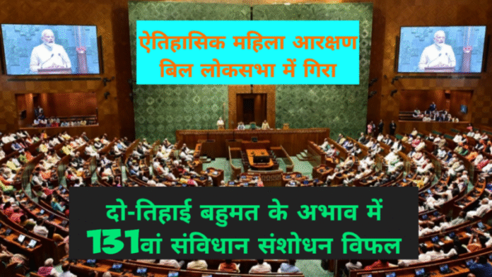 संसद के विशेष सत्र के दूसरे दिन आज भारतीय लोकतांत्रिक इतिहास का एक बड़ा उलटफेर देखने को मिला। महिलाओं को लोकसभा और विधानसभाओं में 33% आरक्षण देने से संबंधित ‘131वां संविधान संशोधन विधेयक’ लोकसभा में पारित नहीं हो सका। सदन में अपेक्षित दो-तिहाई बहुमत न मिल पाने के कारण यह बिल गिर गया, जिससे आधी आबादी की वर्षों पुरानी उम्मीदों को एक बार फिर बड़ा झटका लगा है।