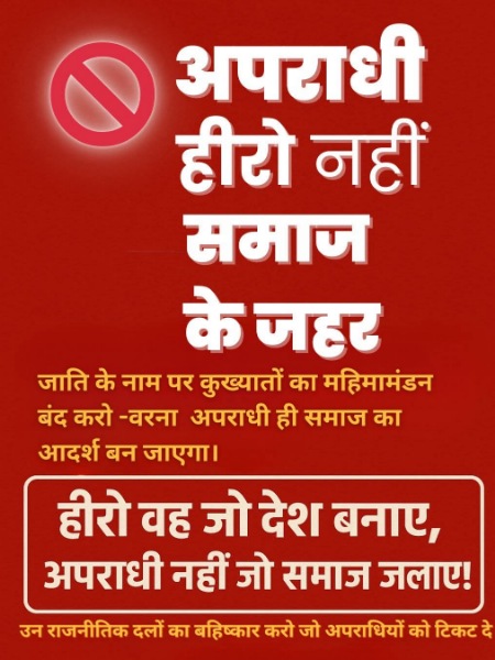 “किसी भी जाति के लोग द्वारा अपनी जाति के नाम पर कुख्यातों का महिमामंडन बंद होना चाहिए, वरना अपराधी ही समाज का आदर्श बन जाएंगे।” यह बात हर नागरिक के दिल की आवाज बनना चाहिए।