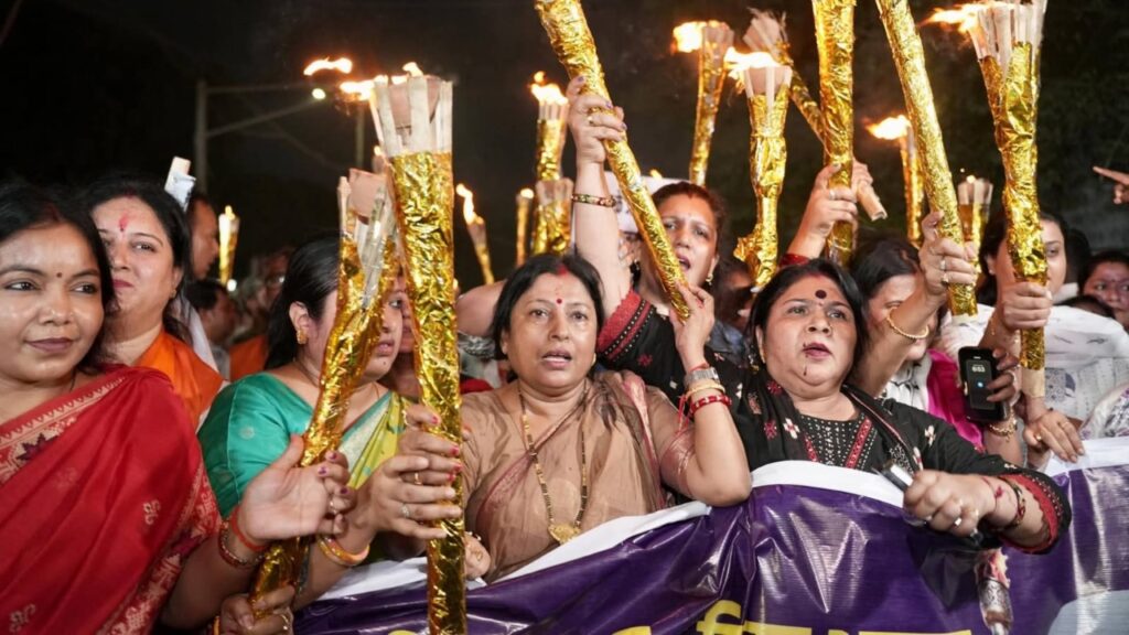 इनकम टैक्स गोलंबर से डाक बंगला चौराहा तक निकले इस जुलूस में शामिल हजारों महिलाओं के हाथों में जलती हुई मशालें थीं। प्रदर्शनकारी महिलाएं “नारी शक्ति का स्वाभिमान, विपक्ष ने किया अपमान” और “आधी आबादी को हक पाने से, रोका क्यों… रोका क्यों…” जैसे नारों से आसमान गुंजा रही थी।