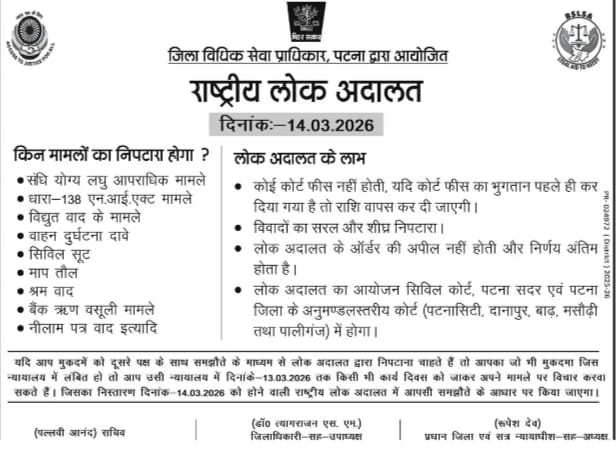 पटना | 25 फरवरी 2026 पटना जिले के विभिन्न न्यायालयों में वर्षों से लंबित मुकदमों के बोझ को कम करने और आम जनता को त्वरित न्याय दिलाने के उद्देश्य से आगामी 14 मार्च, 2026 (शनिवार) को राष्ट्रीय लोक अदालत का आयोजन किया जाएगा।