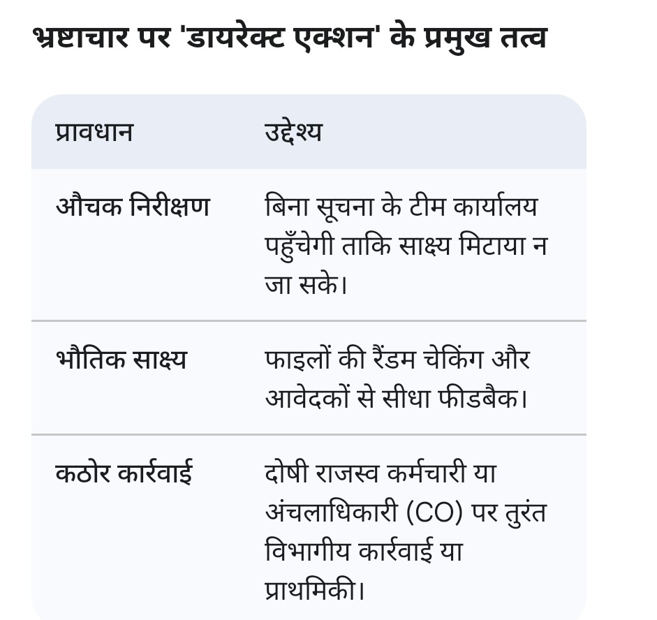 - बिचौलियों की उपस्थिति: कार्यालय परिसर में अनाधिकृत व्यक्तियों (दलाल/प्राइवेट मुंशी) की मौजूदगी पर ऑन-द-स्पॉट कार्रवाई।