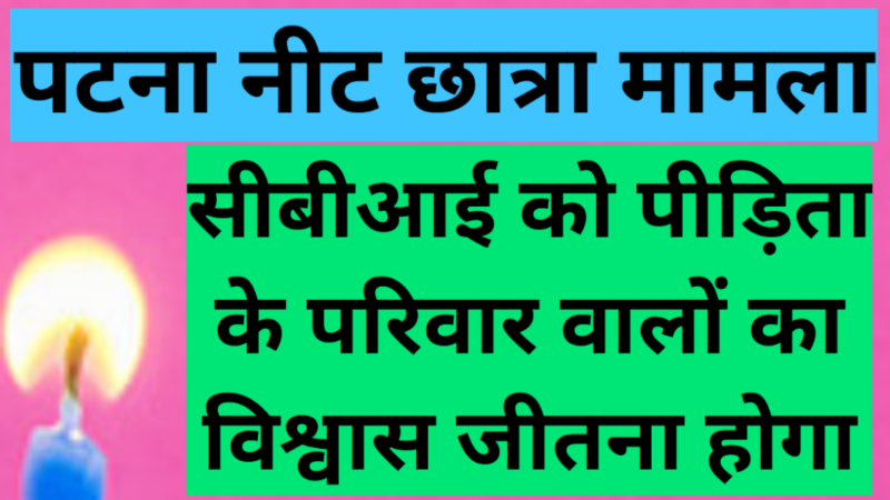 पटना नीट छात्रा बलात्कार एवं हत्या मामले में गत 10 फरवरी से जांच देश की सबसे विश्वसनीय मानी जाने वाली संस्था केंद्रीय जांच ब्यूरो (सीबीआई) कर रही है। जिसे अभी तक जांच में कोई सफलता नहीं मिली है।