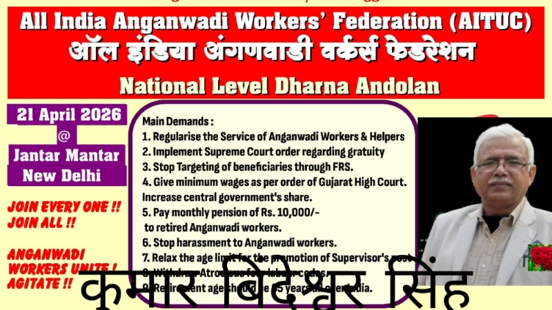 नई दिल्ली: आंगनवाड़ी कार्यकर्ताओं के अधिकारों और उनके सम्मान की रक्षा के लिए अखिल भारतीय आंगनवाड़ी कार्यकर्ता महासंघ (AITUC) ने आर-पार की लड़ाई का ऐलान कर दिया है। महासंघ के प्रमुख नेता कुमार बिन्देश्वर सिंह द्वारा जारी इस आह्वान के तहत, आगामी 21 अप्रैल 2026 को देश भर की हज़ारों आंगनवाड़ी कार्यकर्ता और सहायिकाएं दिल्ली के जंतर-मंतर पर जुटने जा रही हैं।