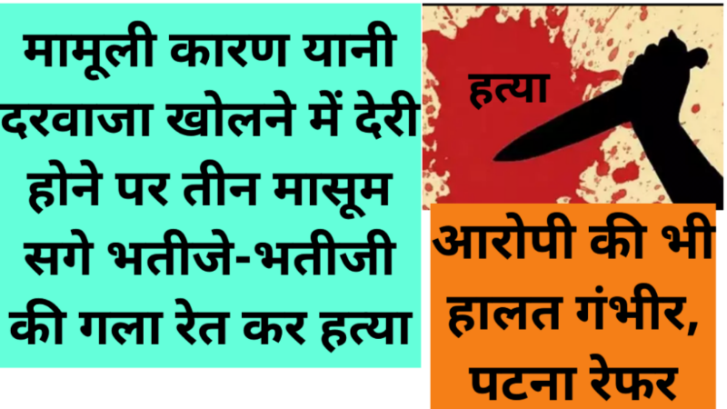 औरंगाबाद (बिहार): बिहार के औरंगाबाद जिले से एक ऐसी रूह कंपा देने वाली वारदात सामने आई है, जहाँ महज चंद मिनटों की देरी ने तीन मासूमों की जान ले ली। हसपुरा थाना क्षेत्र के खुटहन गांव में शुक्रवार की सुबह एक सनकी चाचा ने अपने ही तीन सगे भतीजे और भतीजी की गला रेतकर बेरहमी से हत्या कर दी। वारदात को अंजाम देने के बाद आरोपी ने खुद भी अपनी जीवनलीला समाप्त करने की कोशिश की।